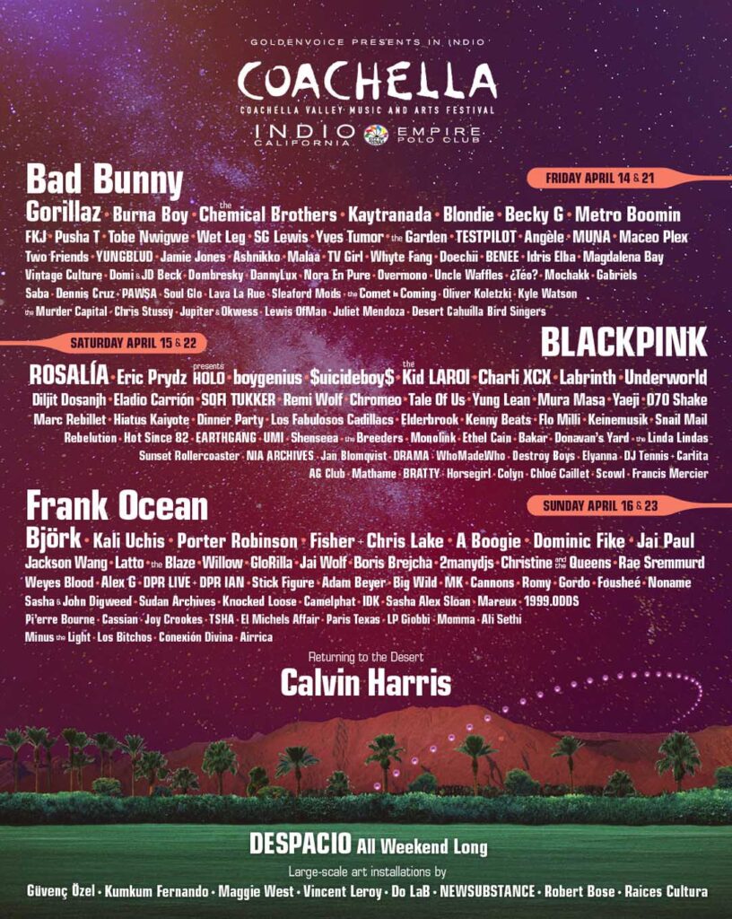 This year’s headliners are Bad Bunny, who already performed at the Main Stage in 2019, BLACKPINK, also were part of the 2019 lineup, and Frank Ocean, who’s presentation was canceled in 2020 due to Covid-19.