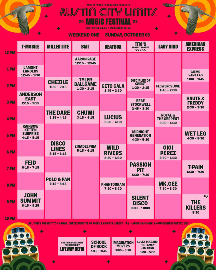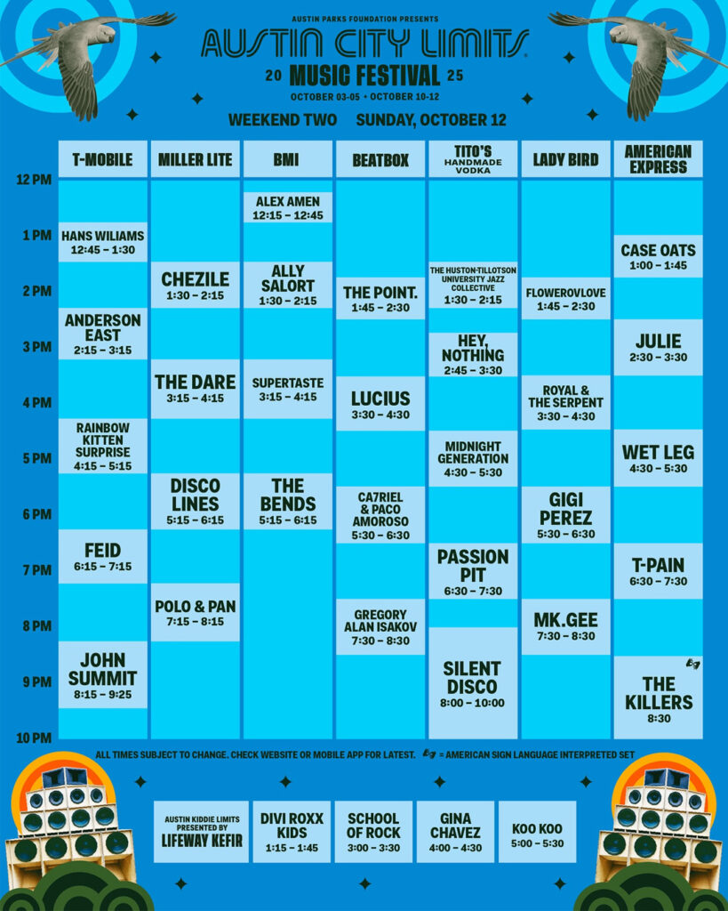 Doja Cat will not be performing on Sundays as originally scheduled, due to finishing her new album, making videos, and preparing for her album campaign, as she explained on social media. In her place, festival favorites The Killers will step in to close out the night with their iconic anthems and crowd-shaking energy. From Mr. Brightside to When You Were Young, expect singalongs that will echo across Zilker Park.