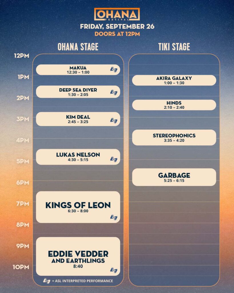Friday, Sept. 26 kicks off with none other than Eddie Vedder, joined by his Earthlings, anchoring a lineup that also features Kings of Leon, Garbage, Stereophonics, and rising favorites like Lukas NelsonHinds, plus more.