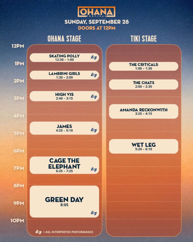 Sunday, Sept. 28 closes in full-force with Green Day, guaranteed to ignite the beach with punk anthems. The day also packs heavy hitters like Cage The Elephant, Wet Leg, Mannequin Pussy, The Chats, and more.