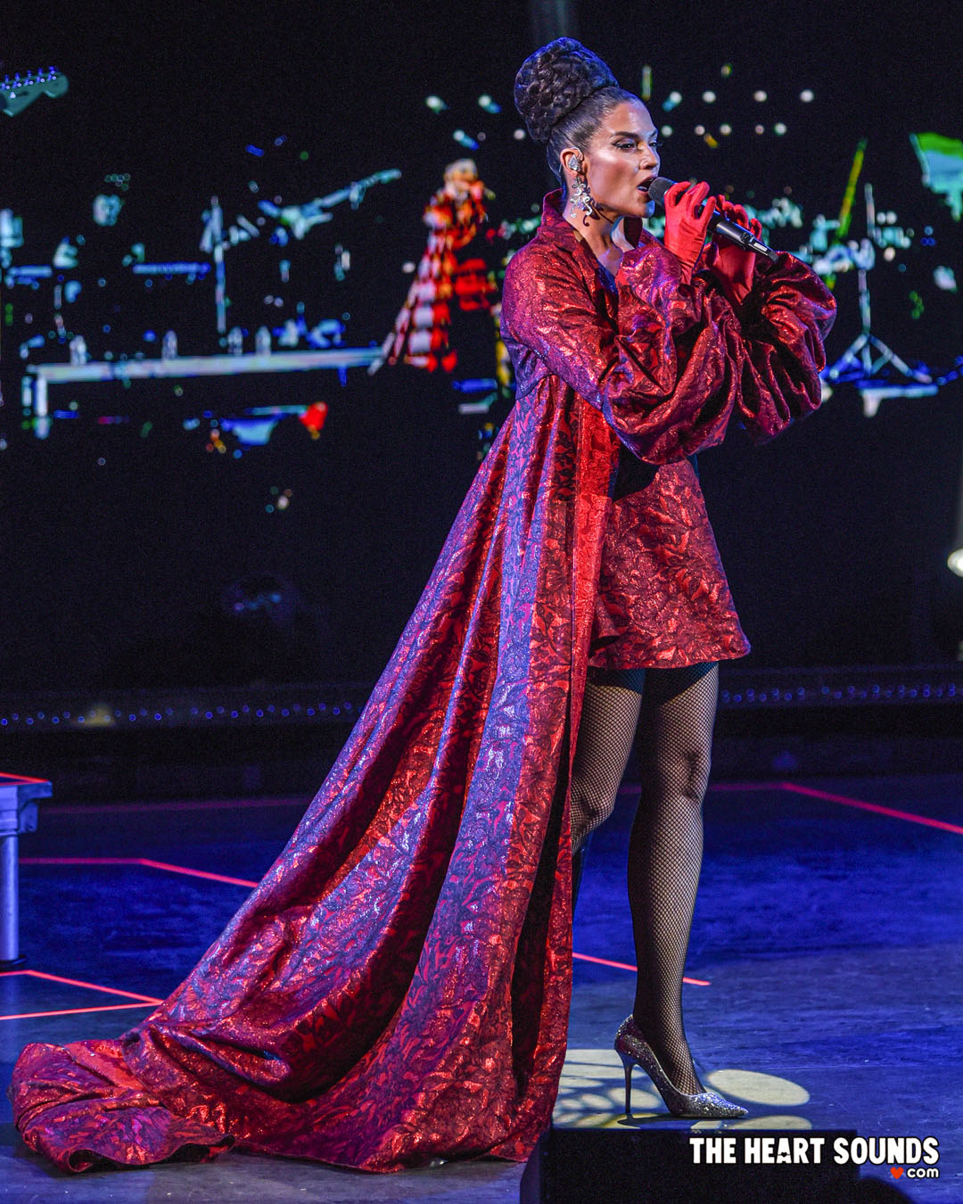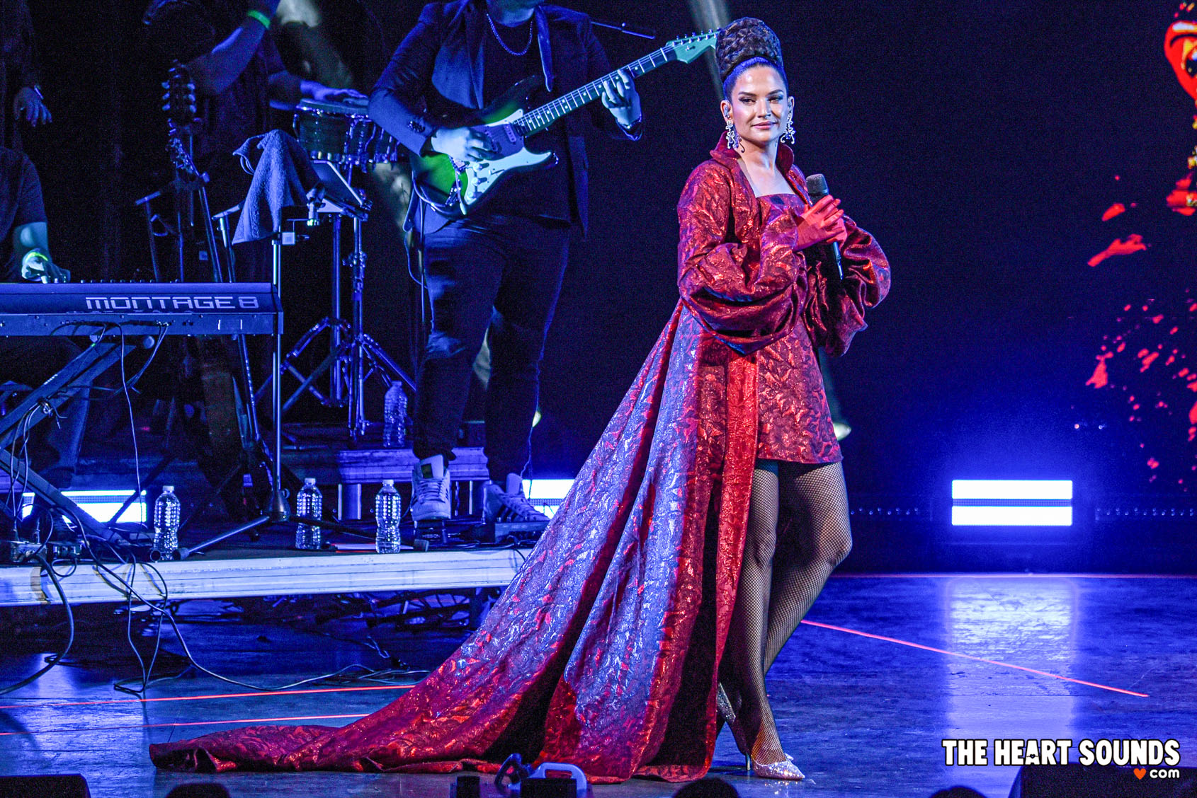 Her ability to switch between genres was on full display: the polished pop sheen of “Quédate Con Ella” flowed seamlessly into the heartfelt balladry of “Pedazos,” each performance infused with emotional precision and theatrical flair.
