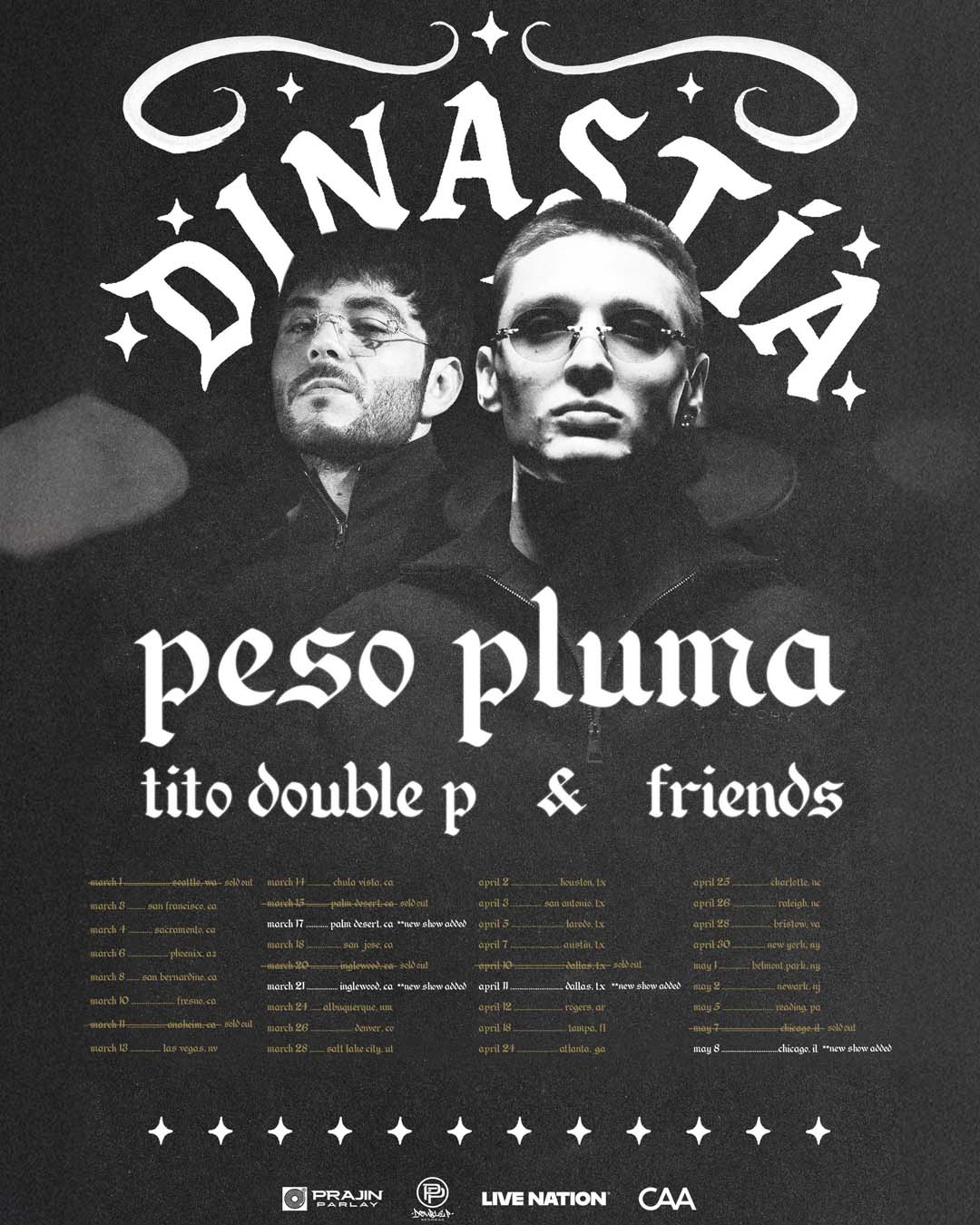 Música Mexicana sensation Tito Double P joins global superstar Peso Pluma on DINASTÍA by Peso Pluma & Friends U.S. Tour across all dates, bringing one of the most anticipated collaborations in Mexican music to stages nationwide. The powerhouse pair recently released their first joint album DINASTÍA, a project that quickly climbed charts across the U.S., Mexico, and beyond, reaffirming their place at the forefront of the genre’s global expansion.
